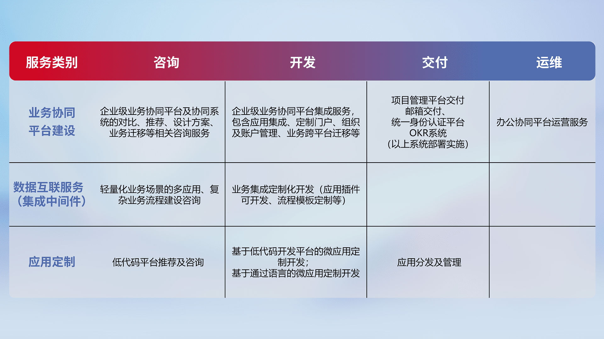 针对钉钉、、、、企微、、IDaas等平台级产品提供产品的规划、、、方案、、、、交付、、定制化开发等服务,,实现如统一协同办公、、、、智能客户服务、、、混合会议管理、、、智能数据查询、、、等业务场景,,,,实现数字化转型。。。。