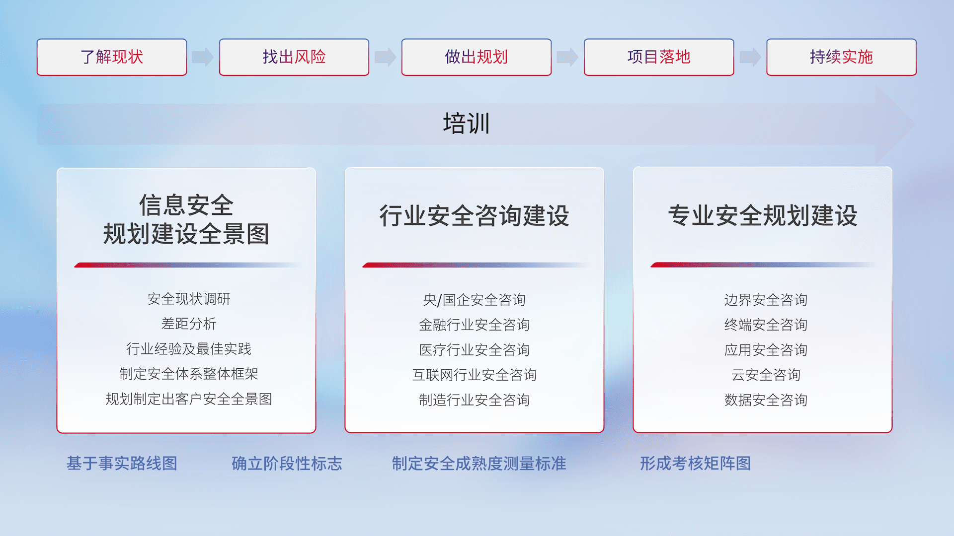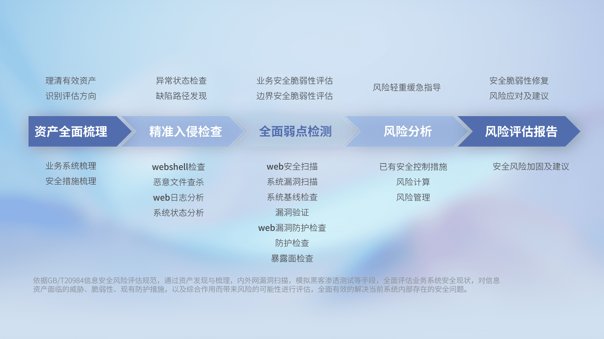 针对客户行业特性,,以专业的安全服务+多厂商联合解决方案提供专属的一站式安全管理服务,,,帮助客户全面感知网络空间威胁,,,基于识别、、检测、、、、分析、、防护、、、监测、、响应的服务理论模型,,,,从方案咨询、、、集成交付、、、评估验证、、、、优化加固、、、、运维运营,,,致力于为客户提供完整的闭环管理式安全服务。。以实战经验为客户打造高抵御风险的安全体系,,,帮助客户发现威胁、、、、对抗威胁、、处置威胁,,不断积累安全对抗能力,,,持续保障数字化安全。。。